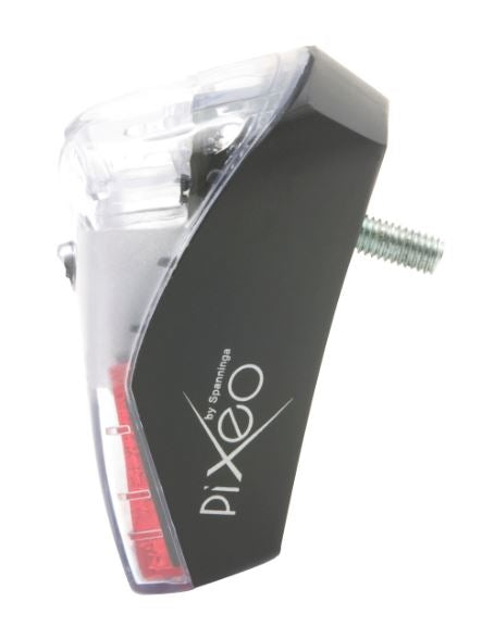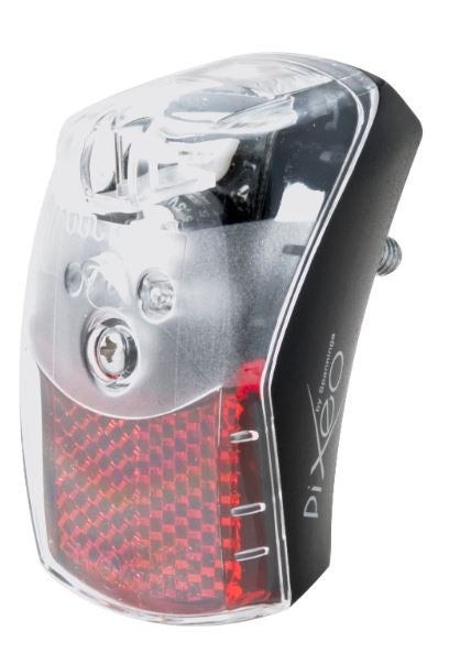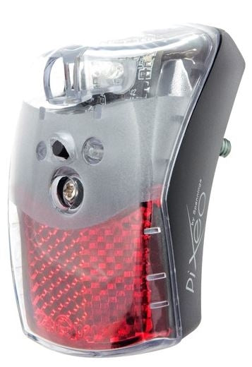 Achterlicht SPANNINGA Pixeo Xb met beschermbeugel. Kleiner, dunner, lichter.... De PIXEO is een perfect achterlicht voor allerlei soorten fietsen en is te monteren op verschillende plaatsen. Zijn unieke vorm en brede venster zorgen voor een grote zichtbaarheid in het verkeer. Mini-mini, maar krachtig! Technische specificaties: Versies: Xds / Xb / Xba Lichtbron: 1 rode LED Stroomvoorziening: Dynamo (Xds)* / Batterijen 2 x AAA 1.5V (Xb, Xba) Levensduur batterij: 120u (Xb, Xba) / Deense regelgeving : 18u (Xb, Xba) Batterij-laag indicator: Ja (Xb, Xba) Functies: Licht- en Bewegingssensor (Xba)/Standlicht (Xds) Gewicht: Kleuren: Zwart/ Chroom