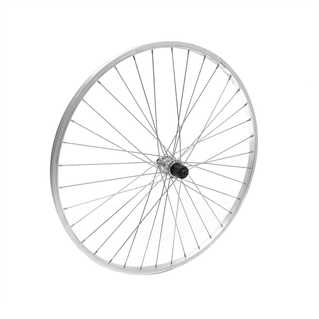 Achterwiel 28x1 5/8x1 3/8 aluminium velg, zilver. Uitval cassette naaf, 7 speed, spaak 13