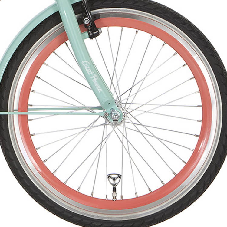 Alpina voorwiel 20inch. Velg: J19DB Salmon, kleurnummer: YS7334 uitgevoerd met afgeslepen zijde. Spaken: silver. Naaf: standaard voornaaf. Geschikt voor: alle modellen Girlpower, Trial en Yabber met deze wielmaat. (Wielen worden geleverd zonder buitenband en binnenband)