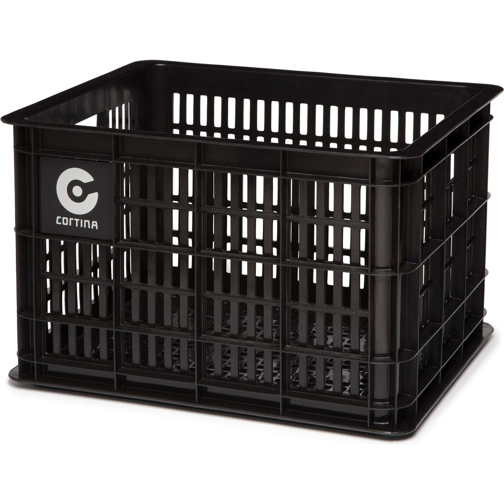 Cortina Krat Dubai zwart. Gemaakt van plastic in de kleur black, voorzien van Cortina logo. Medium formaat, maximale belading afhankelijk van maximaal toelaatbaar gewicht voordrager, inhoud 29,5 Liter, 45 x 35 x 25 cm, Gewicht 1.03 kg.