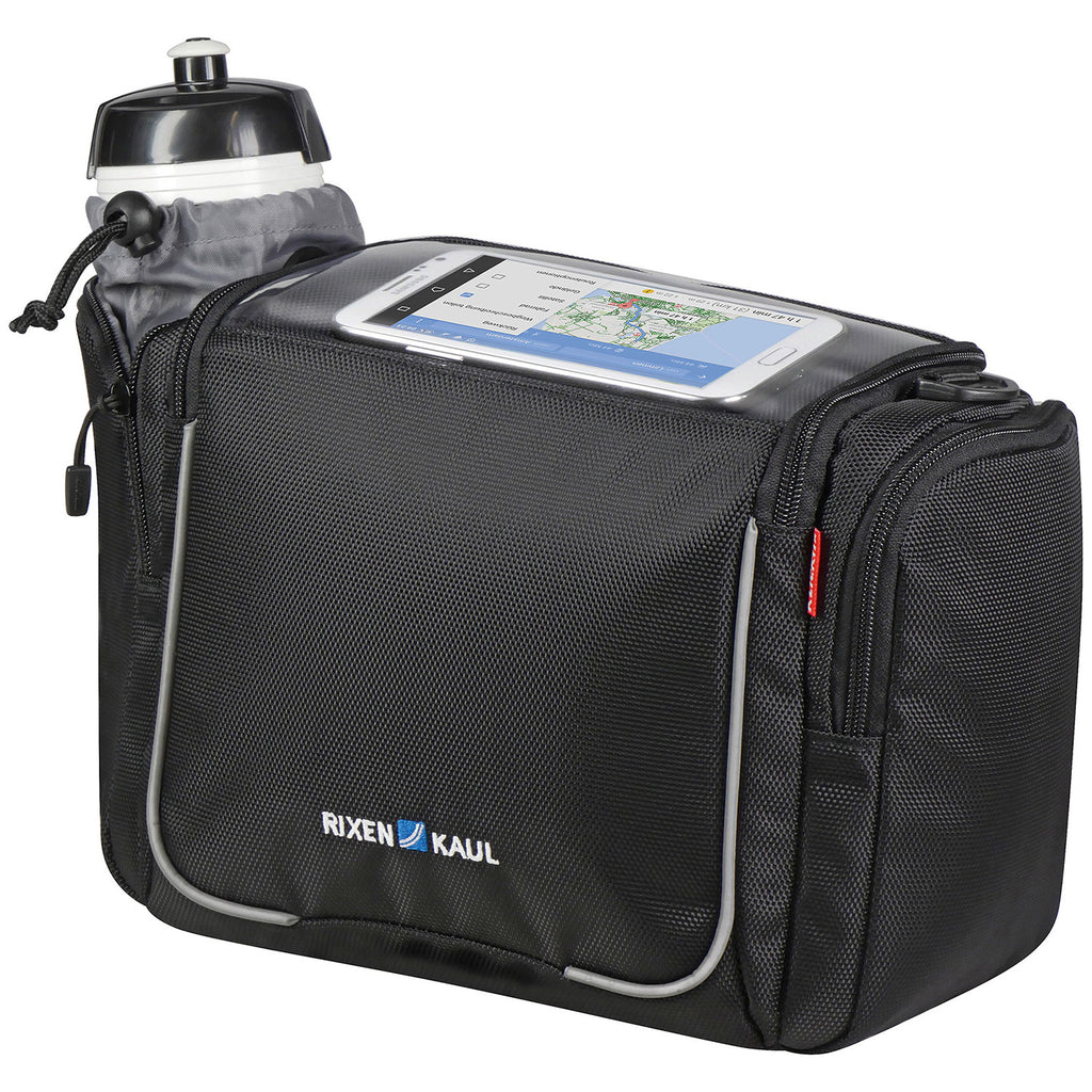 Aventour Sport. Zwarte stuurtas met smartphone- en bidonhouder. Lichte stuurtas met transparant vak voor smartphones en kaarten. In één van de twee ruime zijvakken past een bidon – afsluitbaar met een trekkoord – waardoor deze tas zeer handig is op e-bikes zonder bidonhouder. Voorzien van binnenvak, schouderband, regenhoes en reflector. Met adapterplaat voor snelkoppeling op de stuuradapter aan de achterzijde. Dit product wordt geleverd zonder stuuradapter. Kies de adapterversie die het beste bij uw behoeften past.