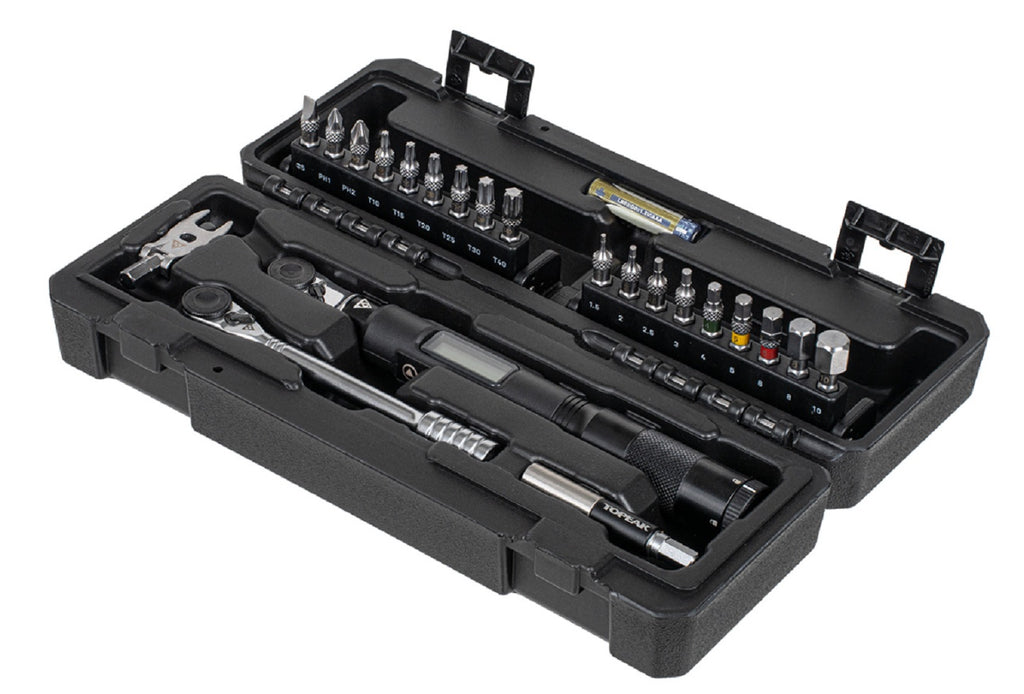 Topeak momentsleutel Torq Stick Pro Digitaal. Een onmisbare gereedschapsset voor dagelijks onderhoud. Bevat een gloednieuwe Heavy Duty Ratchet Tool, een complete set gereedschapsbits en een nieuwe digitale momentsleutel om te voldoen aan uw behoefte aan nauwkeurig koppel. TT2631