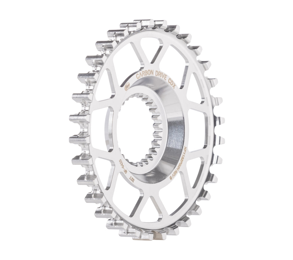 Het Gates CDX Center Track tandwiel voor Pinion-transmissies kan dankzij de speciale bevestiging direct op de Pinion-versnellingsbak worden gemonteerd. Het is ideaal voor gebruik bij MTB, avonturen, bikepacking en trekkingtochten dankzij het bijzonder slijtvaste en lichte roestvrij staal van luchtvaartkwaliteit. Bovendien zorgt het beproefde tandprofiel (Mudports) voor optimale prestaties en een lange levensduur. Het gepatenteerde Center Track-ontwerp met centrale geleideflens voorkomt bovendien dat de riem eraf loopt. Technische gegevens: Materiaal: slijtvast roestvrij staal van luchtvaartkwaliteit Kleur: zilver Compatibel met versnellingsbakken uit de P- en C-lijn en MGU (Motor-Gear-Unit vanaf 39T) van Pinion Center Track-ontwerp met centrale geleideflens Steek: 11 mm Toepassing: City, MTB, Trekking / Gravel Systeem: CDX:Fin Line Interface: Direct Mount / Pinion Aantal tanden: 32